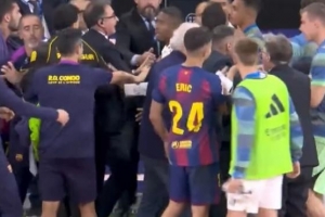 體育資訊10月27日訊 據(jù)西媒eldesmarque報道,國家德比比賽臨近結(jié)束時,巴薩中場佩德里吃到第二張黃牌被罰下場,這一事件成為了“導火索”,直接引發(fā)了雙方替補席人員的“大規(guī)?;鞈?zhàn)”。場面一度失控,以至于安保不得不迅速介入,強行將兩隊替補席分隔開。