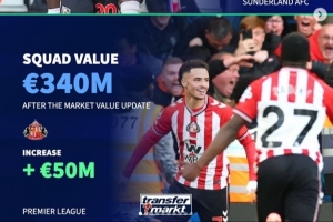 各大聯(lián)賽身價漲/跌最多隊:桑德蘭、科莫大幅上漲,曼城-2千萬