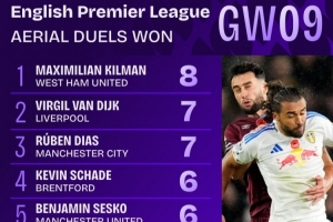 體育資訊10月28日訊 英超第9輪戰(zhàn)罷,據(jù)Squawka數(shù)據(jù)統(tǒng)計,西漢姆后衛(wèi)基爾曼是本輪贏得空中對抗次數(shù)最多的球員,共計8次。