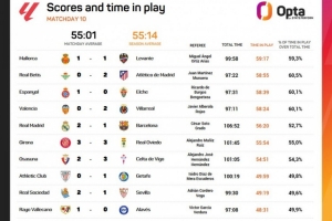 本輪西甲凈比賽時(shí)長最多的是馬洛卡vs萊萬特,為59分17秒;凈比賽時(shí)長最短的則是巴列卡諾vs阿拉維斯,僅48分31秒。