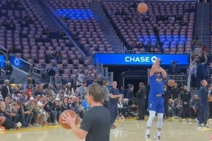 賽前熱身環(huán)節(jié),勇士球星庫里在中圈出手,皮球精準入筐。