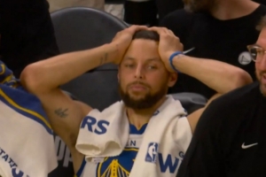 GIF-波斯特命中三分,庫(kù)里抱頭