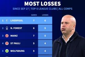 體育資訊10月30日訊 利物浦0-3不敵水晶宮,各項賽事僅7場比賽1勝6負(fù),數(shù)據(jù)統(tǒng)計顯示,利物浦是同一時期五大聯(lián)賽所有球隊中輸球場次最多的。