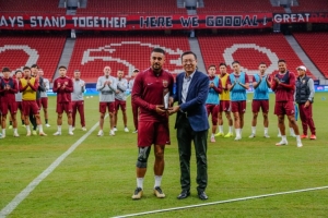 今天的官方訓(xùn)練開始前,俱樂部為兩位球員舉行頒獎儀式。俱樂部總經(jīng)理沙良昌為萊昂納多頒發(fā)第25輪最佳球員獎杯,為李帥贈送百場紀念球衣。