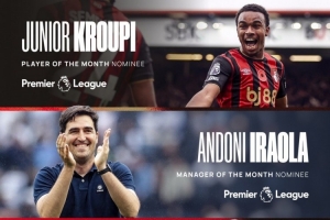 英超官方公布了10月份最佳教練、最佳球員、最佳進(jìn)球的候選名單,伯恩茅斯三個(gè)獎(jiǎng)項(xiàng)全部入圍。