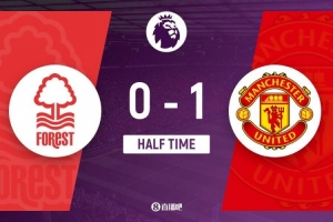 傷停補時3分鐘。上半場比賽結束,諾丁漢森林0-1曼聯(lián)。