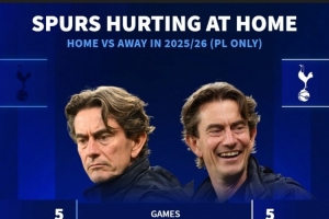 熱刺本賽季英超主場(chǎng)戰(zhàn)績(jī)1勝1平3負(fù),打進(jìn)5球丟掉5球,客場(chǎng)4勝1平保持不敗,打進(jìn)12球僅丟3球。