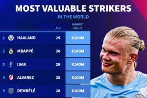 體育資訊11月3日訊 德轉(zhuǎn)列當(dāng)前世界足壇中鋒身價排行,哈蘭德、姆巴佩1.8億歐并列最高,伊薩克1.4億歐,阿爾瓦雷斯、登貝萊1億歐。