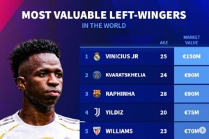 體育資訊11月3日訊 德轉(zhuǎn)列當(dāng)前世界足壇左邊鋒身價排行,維尼修斯1.5億歐居首,克瓦納茨赫利亞、拉菲尼亞9000萬歐并列第二。