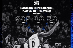 上周馬克西率領(lǐng)76人取得3勝1負(fù)的戰(zhàn)績,場均轟下33.5分5.3籃板9.8助攻。