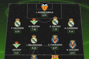 中場(chǎng):安東尼(貝蒂斯,9.45分)、貝林厄姆(皇馬,8.24分)、康薩尼亞(比利亞雷亞爾,8.07分)、莫萊羅(比利亞雷亞爾,8.94分)