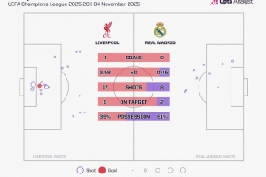 體育資訊11月5日訊 數(shù)據(jù)顯示,皇馬在0-1利物浦的比賽中,預(yù)期進球只有0.45,是近一年里最低。