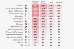 體育資訊11月05日訊 今日歐冠,拜仁客勝巴黎,利物浦擊敗皇馬,阿森納、馬競、熱刺獲勝,那不勒斯、尤文戰(zhàn)平。OPTA更新歐冠奪冠概率。