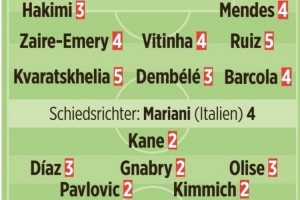 體育資訊11月5日訊 巴黎在本輪歐冠焦點(diǎn)戰(zhàn)主場1-2不敵拜仁,馬爾基尼奧斯送禮、迪亞斯雙響后染紅,《圖片報(bào)》在賽后為兩隊(duì)進(jìn)行了評分:(1分最佳、5分最差,6分相當(dāng)于負(fù)分)