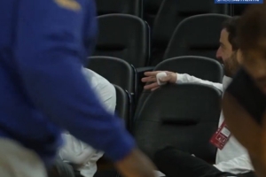 有人拍到鄧?yán)S的經(jīng)紀(jì)人與勇士總經(jīng)理鄧?yán)S在場邊聊天,而庫明加在鏡頭近景訓(xùn)練。