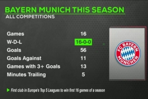 數(shù)據(jù)統(tǒng)計(jì)顯示,拜仁在本賽季各項(xiàng)賽事16戰(zhàn)保持全勝,打進(jìn)56球、丟11球。有13場(chǎng)比賽能夠至少打進(jìn)3球,本賽季共計(jì)僅有5分鐘處于落后。