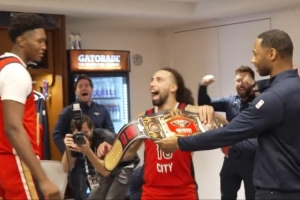 賽后,鵜鶘眾將在更衣室開心慶祝,阿爾瓦拉多接過主帥威利·格林遞過來的金腰帶,將其頒給了奎因。