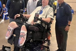 體育資訊11月06日訊 前NBA球員、53 歲的“大竹竿”肖恩·布拉德利今日坐輪椅觀戰(zhàn)獨(dú)行俠,并與他的獨(dú)行俠前隊友波派·瓊斯聊天。