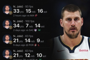 體育資訊11月6日訊 NBA常規(guī)賽,掘金122-112擊敗熱火。約基奇拿到33分15籃板16助攻3搶斷,正負值+18。