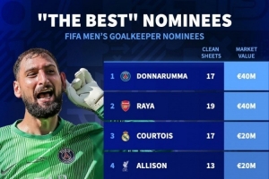 體育資訊11月7日訊 FIFA公布了年度最佳男足門將候選名單,德國轉(zhuǎn)會市場列出了入圍者身價排名,多納魯馬、拉亞4000萬歐居首。