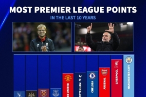 體育資訊11月9日訊 德國轉(zhuǎn)會市場統(tǒng)并列出近10年英超球隊(duì)總積分排名,曼城847分居首,利物浦、阿森納二三位。
