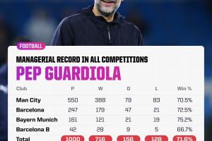 執(zhí)教生涯1000場(chǎng)比賽,瓜迪奧拉取得了716勝156平128負(fù)的戰(zhàn)績(jī),勝率超過(guò)7成。