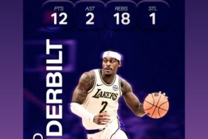 體育資訊11月10日訊 湖人球員范德比爾特更新社媒,轉(zhuǎn)發(fā)了自己昨日比賽的數(shù)據(jù)海報(bào)。
