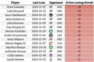 現(xiàn)役球員面對一支球隊(duì)的連敗榜,尤班克斯對雷霆14連敗第一,威少對森林狼10連敗,5天后雙方再度交手