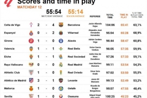體育資訊11月10日訊 數(shù)據(jù)網(wǎng)站OPTA盤點了本輪西甲有效時間榜單,其中巴薩4-2塞爾塔以及比利亞雷亞爾2-0西班牙人的兩場比賽有效時間超過65分鐘。