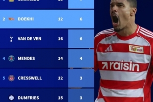 本賽季五大聯(lián)賽后衛(wèi)進球榜:格里馬爾多7球居首,范德芬6球次之