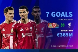 利物浦在今夏共計(jì)花費(fèi)3.65億歐元基礎(chǔ)轉(zhuǎn)會(huì)費(fèi)引進(jìn)了維爾茨(勒沃庫森)、?;倏耍ǚㄌm克福)、伊薩克(紐卡斯?fàn)枺?人至今共計(jì)貢獻(xiàn)7球5助攻。