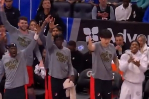 首節(jié)比賽,開(kāi)拓者中鋒羅伯特·威廉姆斯飚中生涯第二記三分,楊瀚森與替補(bǔ)席的隊(duì)友們開(kāi)心慶祝。