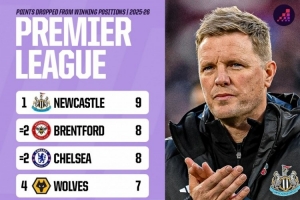 體育資訊11月11日訊 Opta統(tǒng)計了本賽季英超球隊領先之后丟掉的積分,并列出榜單,紐卡9分最多,布倫特福德、切爾西8分次席。