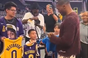 威少給小球迷的球衣簽名,簽了雷霆和火箭的唯獨略過了湖人的。