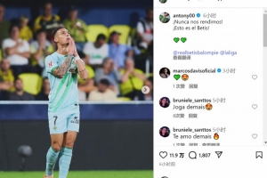 安東尼社媒曬出慶祝進球的照片,配文:“我們永不言棄,這就是貝蒂斯!”