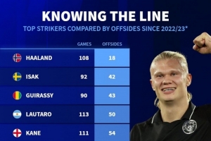 體育資訊11月12日訊 德國轉(zhuǎn)會市場統(tǒng)計了2022-2023賽季以來頂級前鋒(中鋒)在聯(lián)賽中的越位次數(shù),哈蘭德18次最少,C羅143次最多。