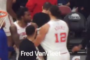 昨日第三節(jié)結(jié)束,伊森和亞當(dāng)斯有些沖突,互相拉拽球衣,火箭助教迅速介入拉開(kāi)雙方。火箭其他球員也有些懵……