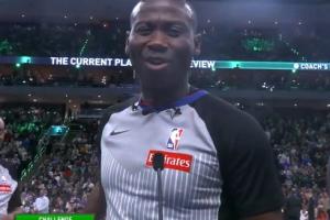 “我們都沒看到是誰出界,判罰結(jié)果是隨便來兩個(gè)人(any two)中圈跳球。雄鹿對(duì)這球提出了挑戰(zhàn)?!?/p>