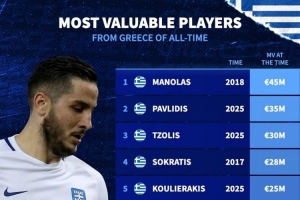 希臘球員歷史身價排名:馬諾拉斯4500萬歐居首,帕夫利季斯次席