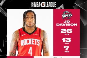 效力于毒蛇的火箭雙向合同球員JD·戴維森和以賽亞·克勞福德表現(xiàn)出色,分別貢獻(xiàn)26分7籃板13助攻,和27分7籃板。