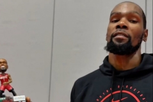 視頻中杜蘭特介紹搖頭娃娃細(xì)節(jié)。官推表示,今天前3000名入場的球迷將獲贈娃娃。