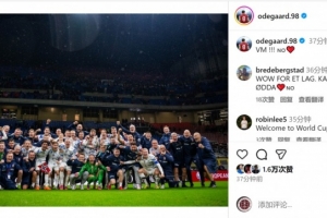厄德高因傷缺席本場比賽,賽后他在社交媒體上曬出挪威隊(duì)大合照,慶祝球隊(duì)出線,配文:“世界杯!”