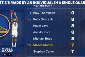 據統(tǒng)計,穆迪單節(jié)7記三分,與庫里并列歷史第三多,NBA歷史單節(jié)三分紀錄由克萊保持(9記)。