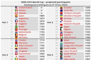 體育資訊11月17日訊 世預(yù)賽激戰(zhàn)正酣,目前世界杯48支參賽隊已確定32席,數(shù)據(jù)機(jī)構(gòu)Football Meets Data給出了最新的世界杯分檔預(yù)測。