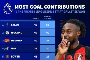 體育資訊11月18日訊 德國轉(zhuǎn)會(huì)市場統(tǒng)計(jì)了上賽季至今球員在英超參與進(jìn)球的數(shù)量,并列出榜單,薩拉赫53球居首,哈蘭德40球次席,姆伯莫34球第三。