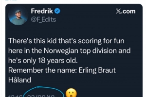 2018年9月23日,記者Fredrik在社交媒體上寫道:“挪威頂級(jí)聯(lián)賽有一個(gè)少年,進(jìn)球如同探囊取物,而他只有18歲。請(qǐng)記住這個(gè)名字——埃爾林·布賴于特-哈蘭德?!?/p>
