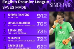 體育資訊11月19日訊 Squawka統(tǒng)計(jì)17-18賽季至今英超門(mén)將撲救次數(shù),皮克福德912次居首,法比安斯基第二。