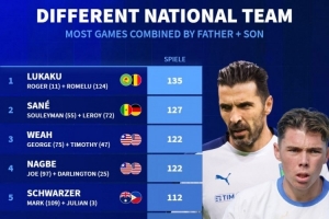 體育資訊11月20日訊 德國轉(zhuǎn)會市場統(tǒng)計了足壇父子代表不同國家隊的出場次數(shù),并列出榜單,布馮兒子路易斯·布馮一周之內(nèi)在捷克U19青年隊兩次戴帽,有望入選捷克成年隊,因此德轉(zhuǎn)也提前將布馮父子列入榜單。