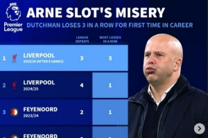 斯洛特執(zhí)教生涯首次遭遇聯(lián)賽3連敗,此前5個賽季均未出現(xiàn)連敗