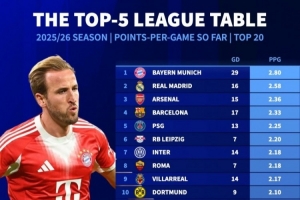 體育資訊11月21日訊 五大聯(lián)賽戰(zhàn)火即將重燃,《轉(zhuǎn)會市場》也統(tǒng)計了本賽季五大聯(lián)賽球隊場均拿分情況,拜仁獨自領跑。